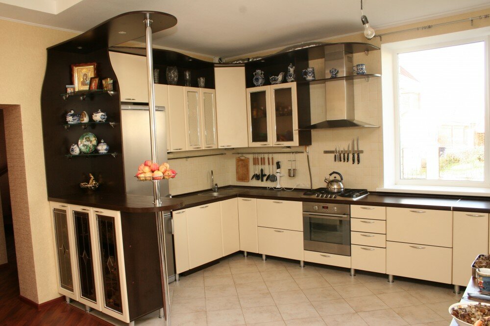 - Современный дизайн интерьера угловой кухни с барной стойкой