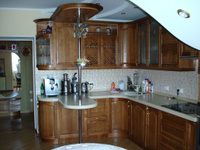 Угловой кухонный гарнитур в классическом стиле с изысканной барной стойкой – признак наличия хорошего вкуса у хозяев дома