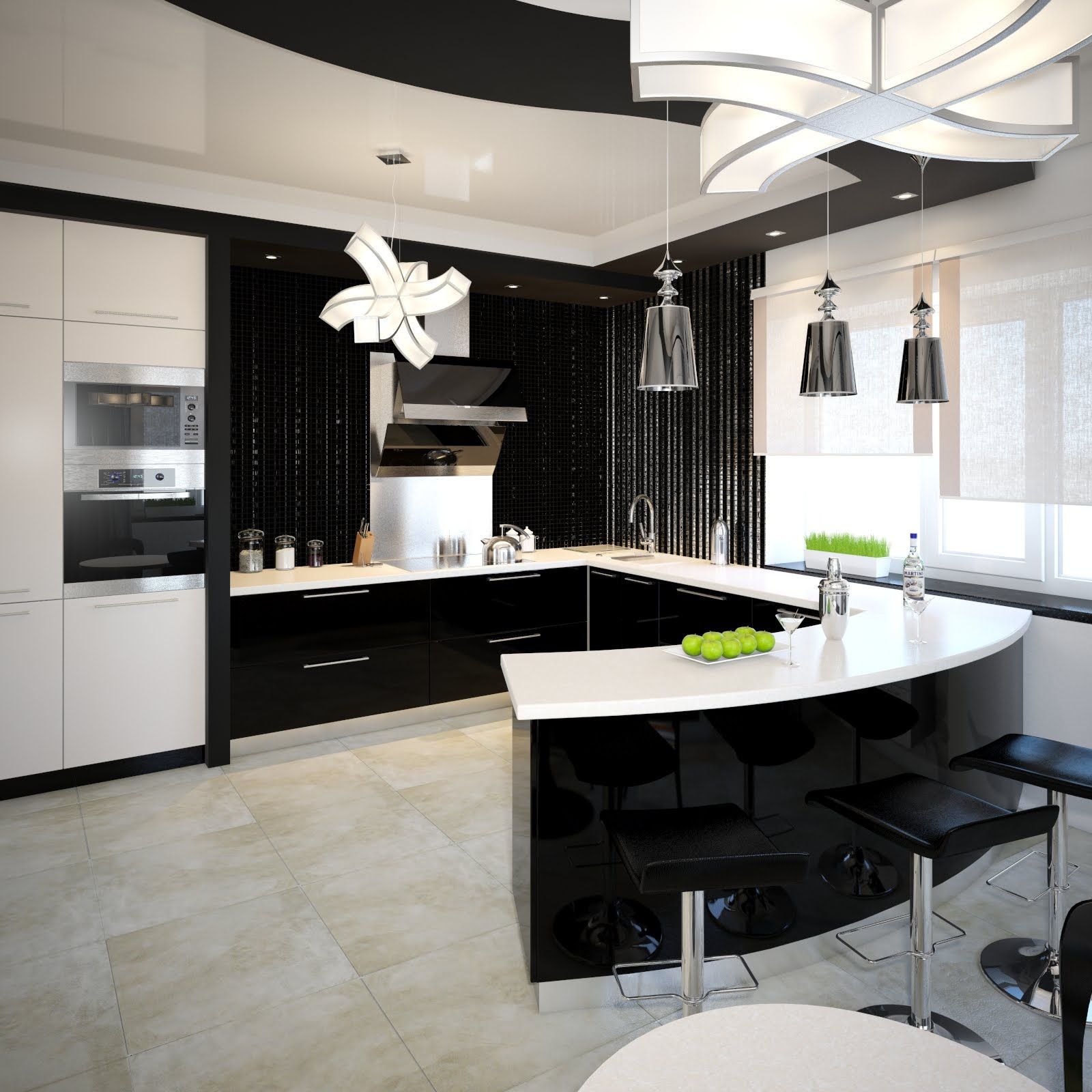 Дизайн интерьера черно-белой кухни в стиле хай-тек