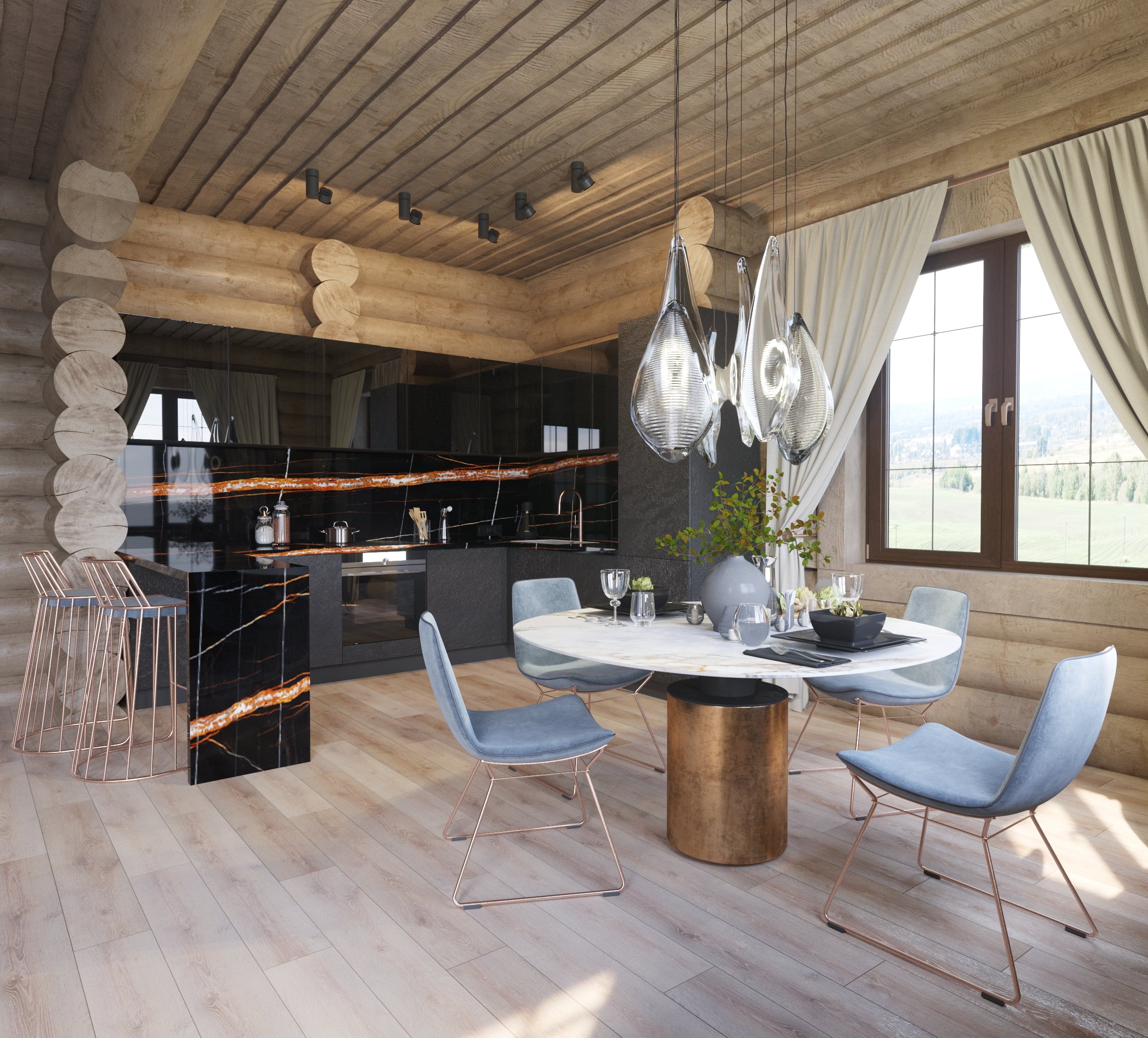 Кухня в доме из бревна: интерьер комнаты в жилище из оцилиндрованного бревна, дизайн кухни-гостиной в деревянном коттедже