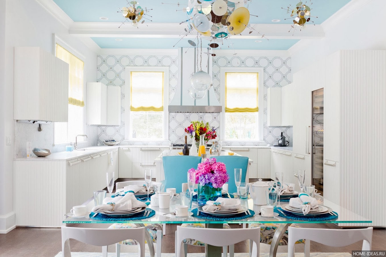 Оно достаточно контрастно и свежо, поэтому станет отличным вариантом для южной кухни голубого цвета. В комнате будет много света, но при этом сохранится желанная прохлада.