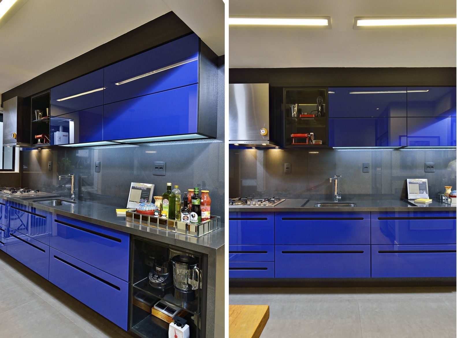 В синем цвете также можно оформить столешницу или элементы декора.