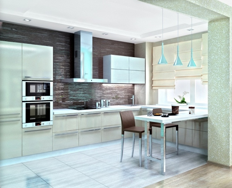 Огромное значение при этом уделяется выбору цветов. Приветствуется игра на контрасте. Очень красиво смотрится тандем из натуральных оттенков и ярких акцентов. Вся мебель должна быть изготовлена из качественных и надежных материалов. Современный стиль предполагает долговечность и устойчивость предметов к износу. При правильном подходе подобная кухня может служить своим владельцам много лет, сохраняя свой первоначальный вид. Поверхности должны быть ровными и гладкими, а освещение — ярким и полноценным. При желании можно использовать сразу несколько источников света.