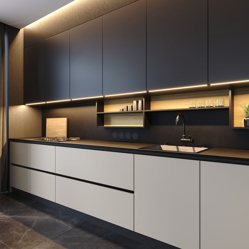 Усилят эффект «утопленные» розетки, столешницы, сливающиеся с варочными панелями в единое целое.