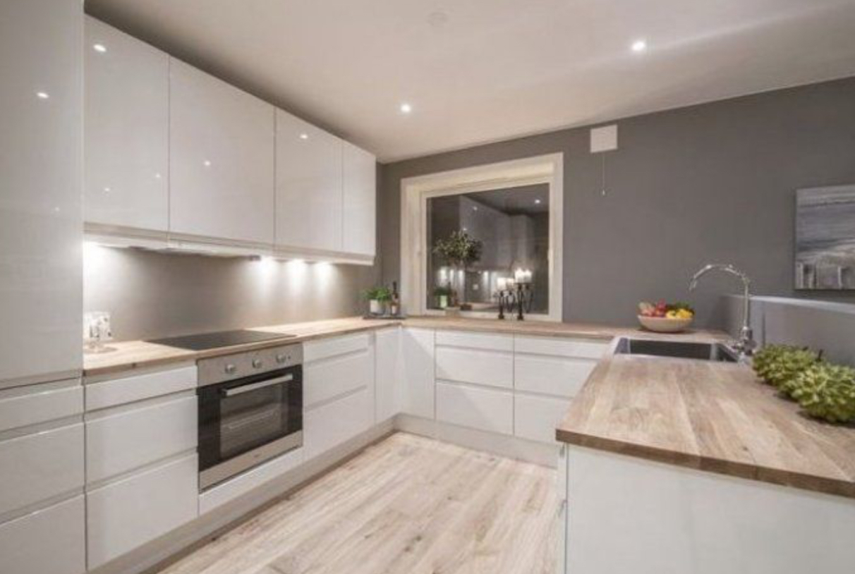 Что особенно важно светлую кухню можно вписать практически в любые базовые условия. К примеру, при наличии вполне распространенного варианта с темными деревянными полами и светлыми стенами можно разыграть карту классического для кухонь сочетания — выбрать кухню светлее стен и подобрать для нее столешницу и фартук в тон полу.