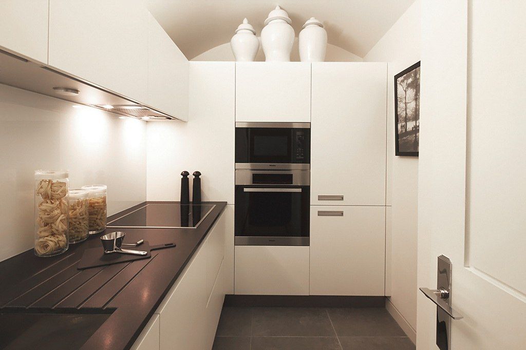 Heusch Inc.Эта кухня с одинарной стенкой представляет собой очень очаровательную стойку с черной стильной столешницей.