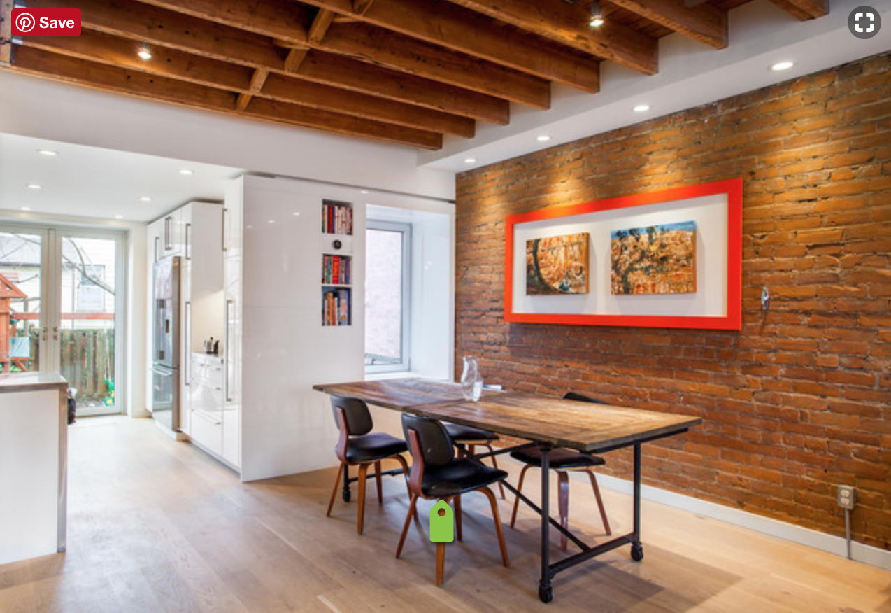 - Ламинатом темного цвета отделывают стену, вдоль которой расположится зона приема пищи.