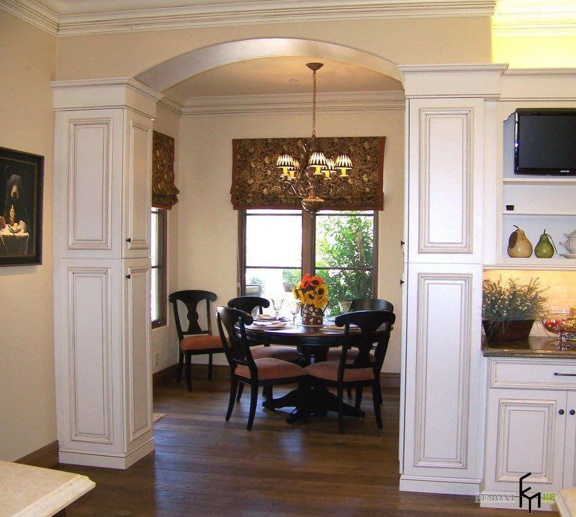 Теперь, когда мы убедились что лепнина на кухне, это не только красиво, но и практично, постараемся разобрать несколько великолепных вариантов использования лепного декора в кухонной зоне. В первую очередь, следует заметить, что профессиональные дизайнеры не ограничивают выбор гипсовых изделий и с успехом используют гипсовые декоративные элементы любого размера и формы – розетки и бордюры, плинтуса и молдинги, арки и полуколонны, купола и карнизы, панно и пилястры. При этом наиболее интересными вариантами, которые носят беспроигрышный характер, выступают следующие интерьерные решения: