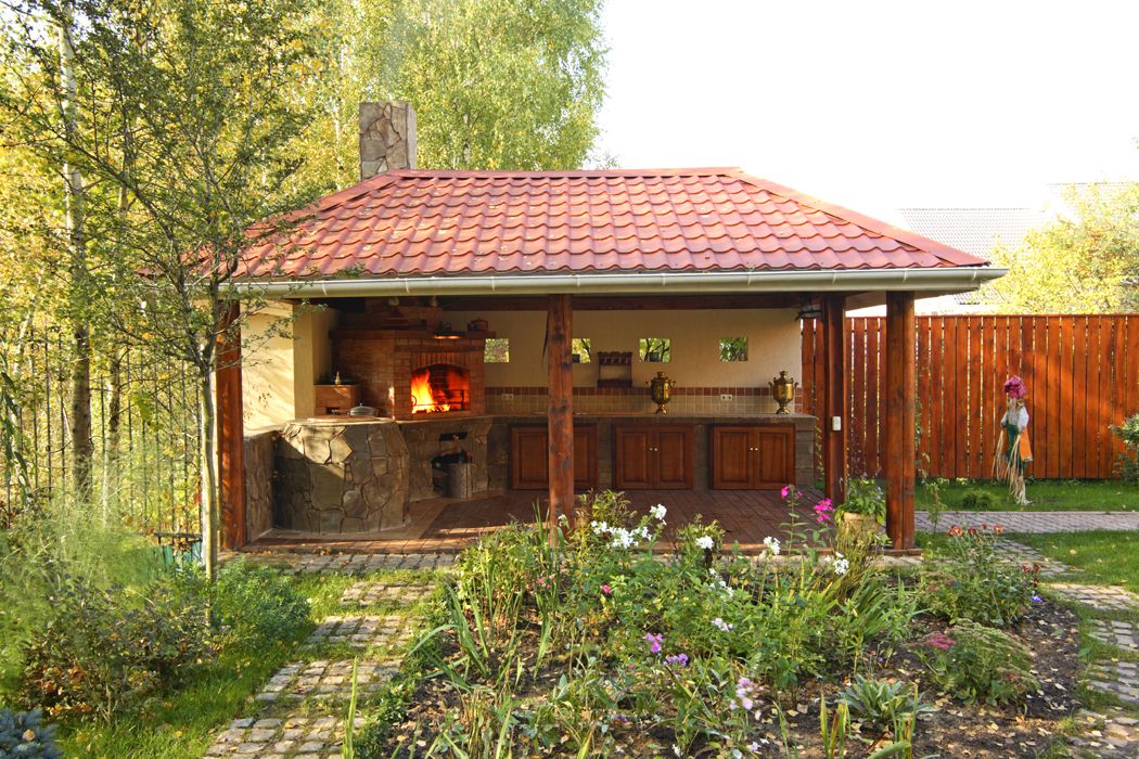Размещение летней кухни неподалеку от дома облегчает подводку коммуникаций