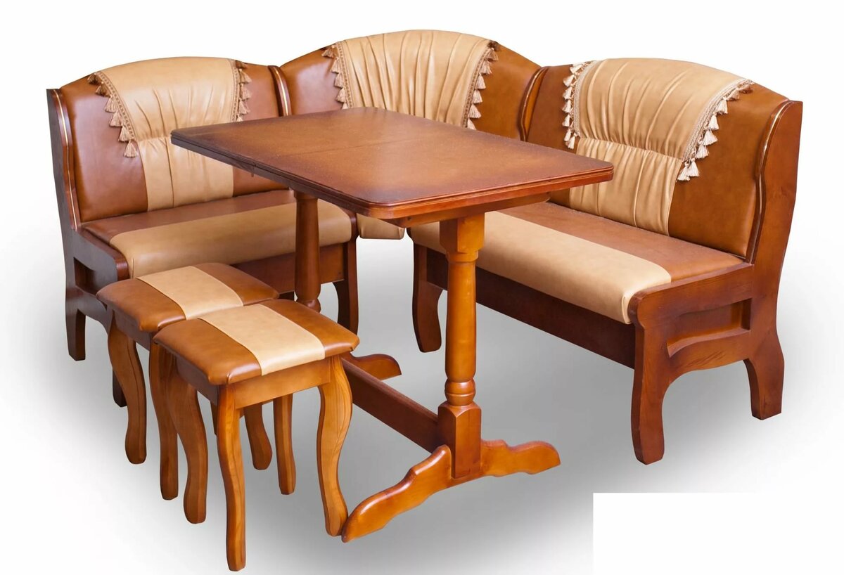 Кухонный уголок может быть изготовлен и из цельного массива дерева. Прочности и долговечности такому изделию не занимать. Диван выдержит не один переезд и останется на память еще вашим внукам! Конечно, стоимость изделия из натурального дерева очень высока, но неограниченный срок эксплуатации окупает затраты.