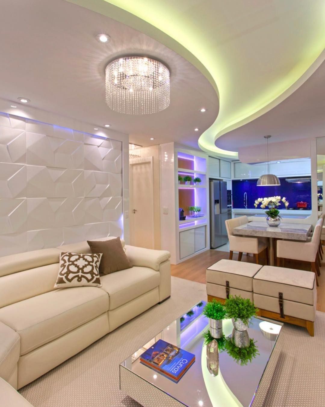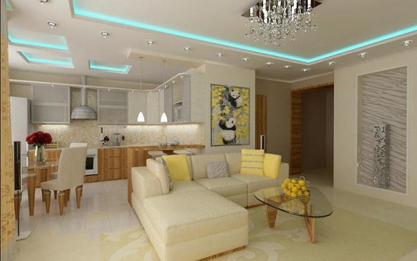 Не менее эффектным решением является установка многоцветного натяжного потолка, который представляет собой несколько отрезков, спаянных между собой. Гипсокартонную систему просто окрашивают в разные оттенки, соответствующие дизайну интерьера кухни-гостиной.