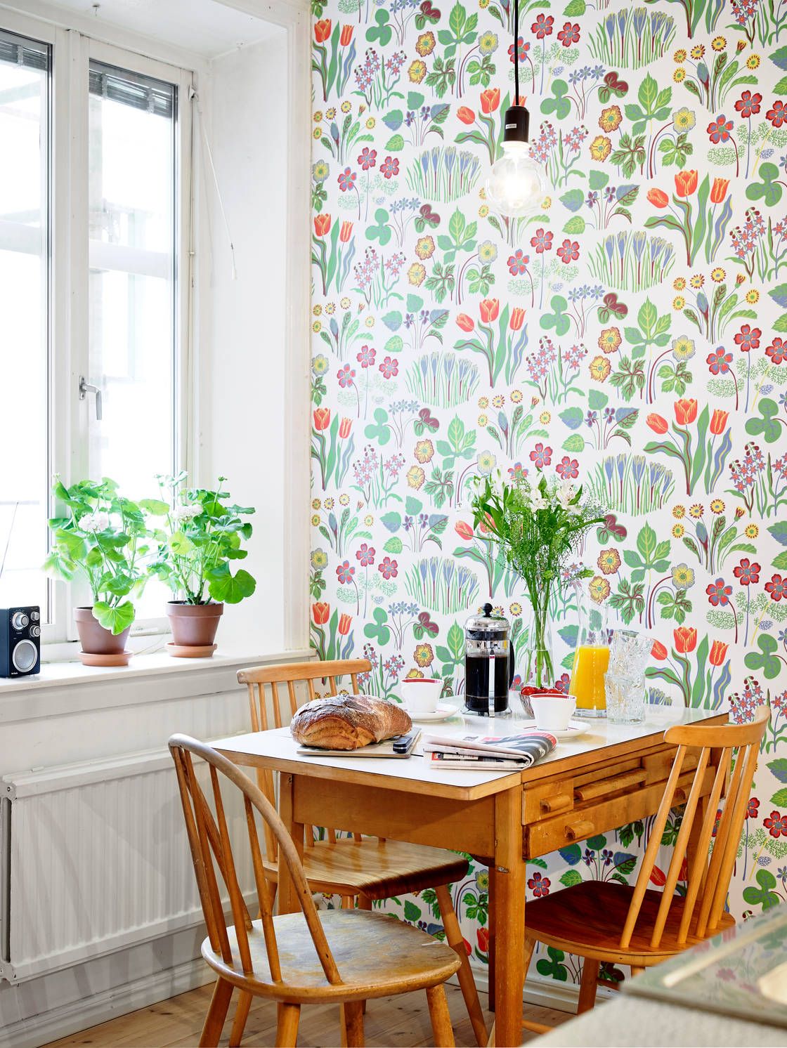 Полотна в таком стиле — светлые цвета или обои с мелкими геометрическими узорами, листьями, цветами и деревьями.