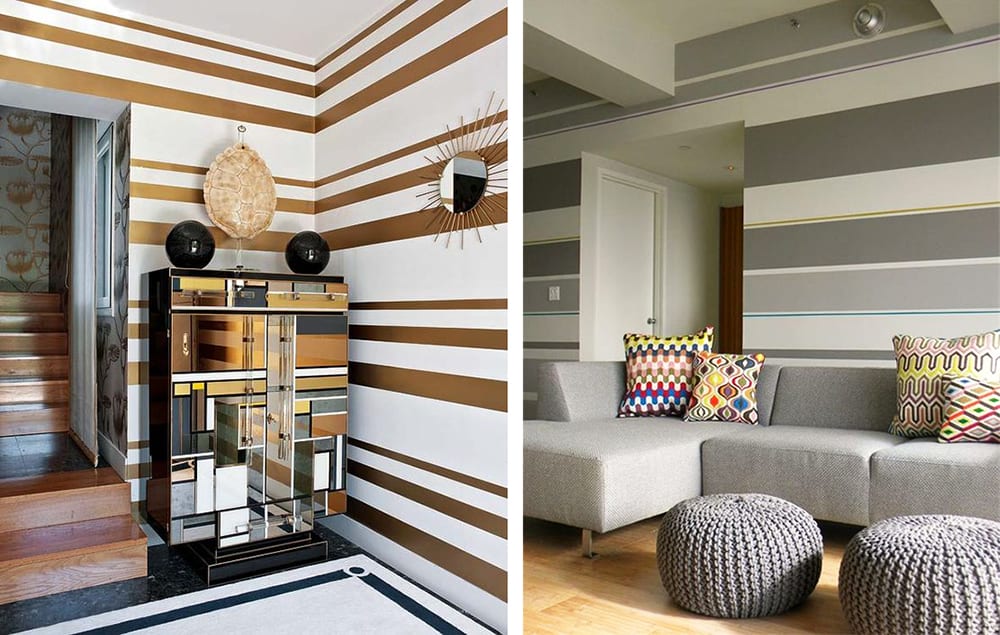 Вертикальные полосы на стенах внесут симметрию в помещение, а также визуально «вытянут» его в высоту, горизонтальные же, наоборот — сделают помещение более широким, но потолок при этом визуально будет казаться более низким.