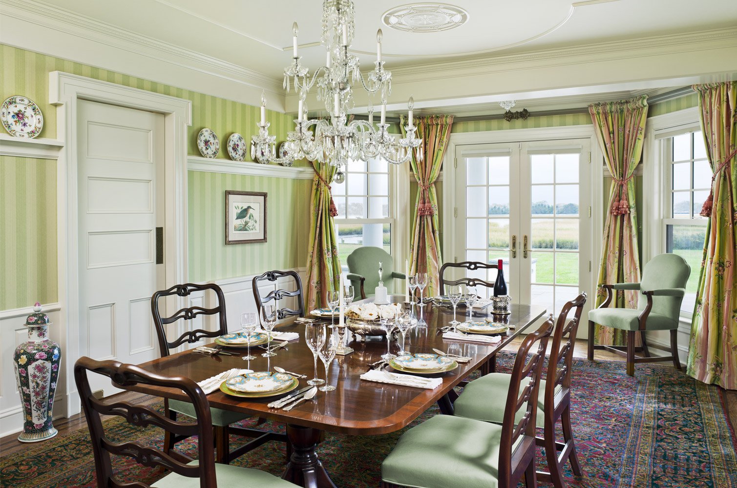 - Деревянная мебель прекрасно сочетается с зелено-белыми обоями.
