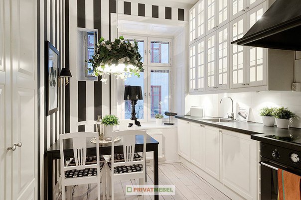 Как ни странно, но сегодня достаточно часто можно встретить фото интерьеров кухонь, в которых используются полосатые обои. Это своего рода новый тренд у дизайнеров.