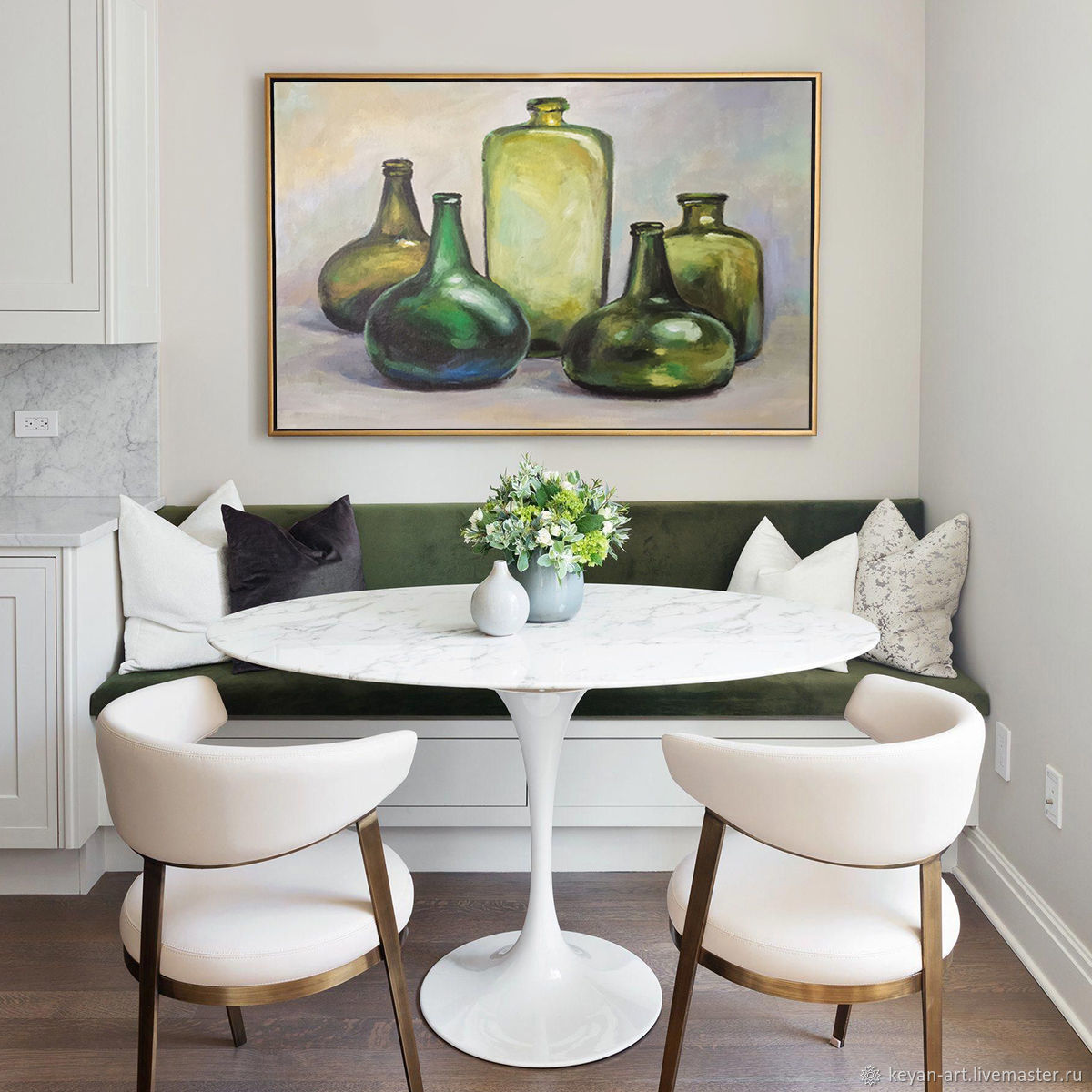 Если обеденная группа находится на некотором расстоянии от стены, а сама стена достаточно большая, подберите масштабную картину, которая займет половину или три четверти поверхности: крупное, броское пятно выгодно выделит зону столовой, сделает интерьер визуально дороже.
