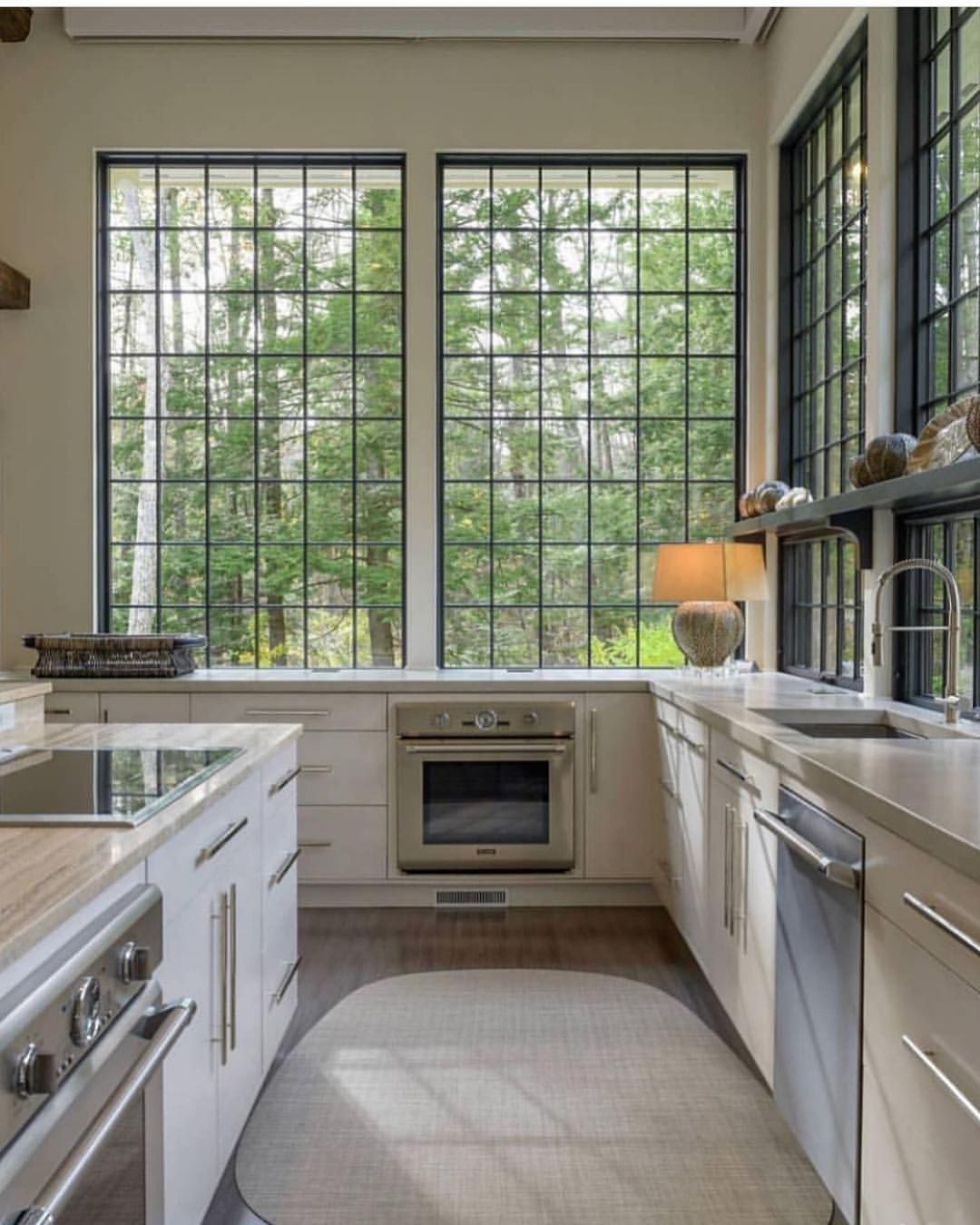 Массивные окна открывают жизнь внутри кухни. Поэтому необходимо правильно подойти к организации интерьера. Актуальная идея создать две разные зоны в одном помещении. Зона готовки с центральной вытяжкой придают кухне объем и богатый стиль. Обеденная зона выполнена в бежевом цвете. Кухонный гарнитур создает видимый контраст на фоне темных панорамных окон.