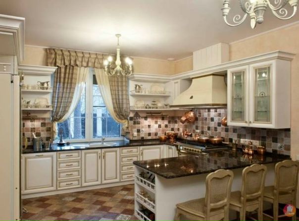 Большая кухня нестандартной формыИсточник confettissimo.comМодно оформлять большие рамы не только жалюзи, но и шторами с интересным орнаментом. Сделать акцент можно с помощью винтажной подставки с фигурными ножками. На такие полки принято ставить различный декор: цветы, статуэтки.