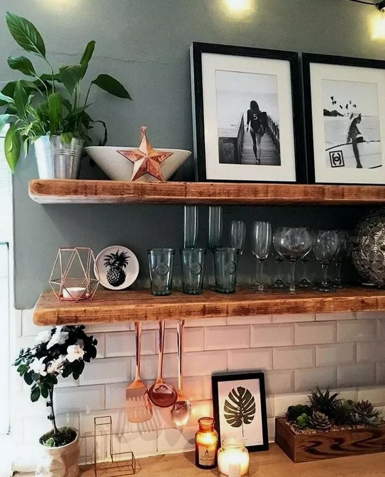 Это решение идеально подходит для демонстрации какой-нибудь из ваших необычных столовых приборов или ваз. Эти открытые полки могут выглядеть как шкафы или контрастировать с ними.Например, если у вас есть шкафы из дерева, вы можете использовать полки, окрашенные в какой-нибудь яркий цвет. Хотя, если ваши шкафы имеют глянцевую яркую отделку, настенные полки из натурального дерева или покрытые медью могут стать к ним отличным дополнением.