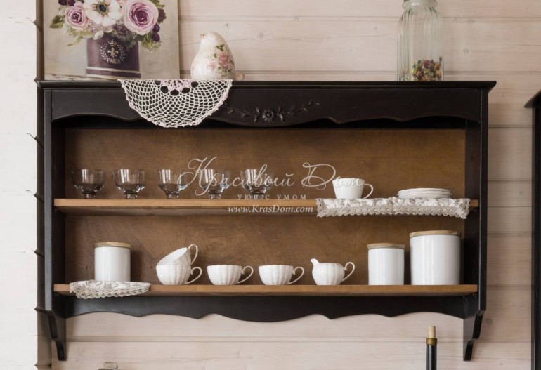 - Кантри, прованс, деревенский. Полки для таких стилей должны быть массивными, деревянными, натуральной или состаренной расцветкой. В качестве украшения можно использовать занавески с цветочным принтом. На таких изделиях обычно располагают тематические аксессуары – тарелки, предметы из природных материалов, деревянные фигурки.