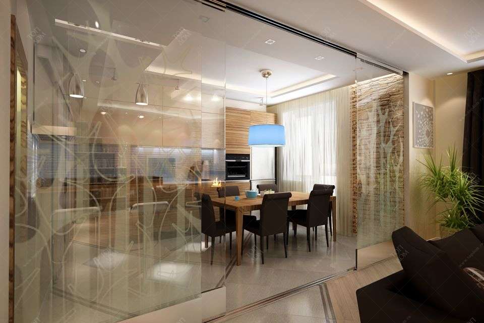 Удобное зонирование кухни и гостиной перегородкой из стекла