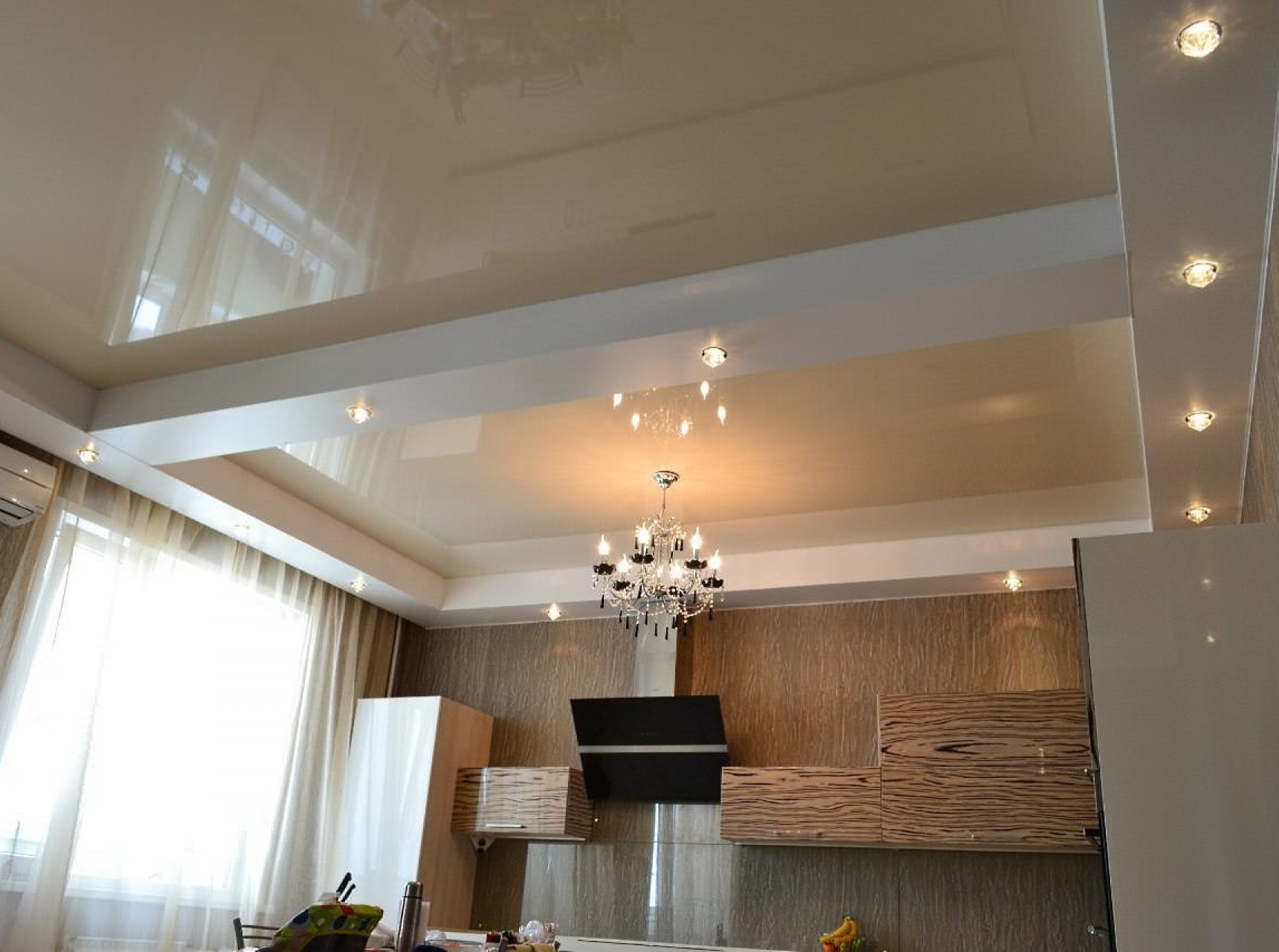 Если середину кухонного потолка из двух уровней выполнить в виде экрана и оформить его фотообоями с кухонной тематикой или зеркальными, то такое решение окажется очень оригинальным и будет всегда радовать и вас, и ваших гостей.