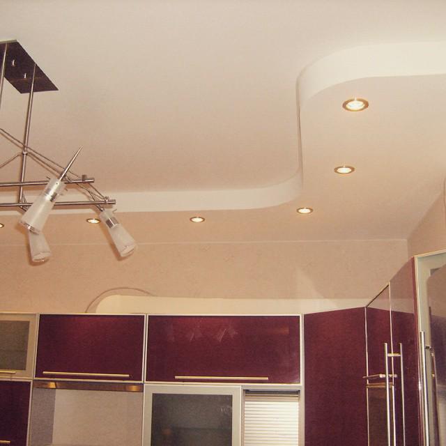 - Высота потолков и площадь кухни. В маленьких кухнях в хрущевках, например, вряд ли будут уместны объемные подвесные конструкции. Хотя уже большая площадь объединенной-кухни гостиной в той же типовой серии домов позволяет сделать двухуровневый потолок с минимальным расстоянием профиля от исходного основания.