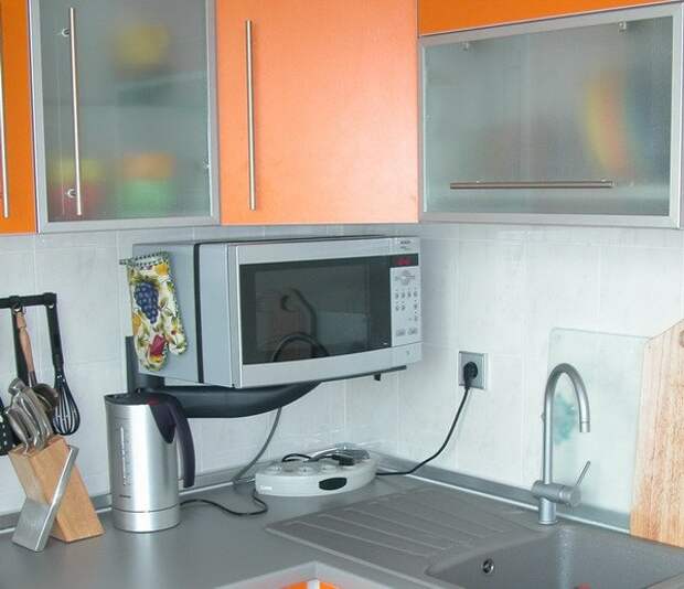 Совет! Настенная полка на кухне не должна располагаться слишком высоко от пола. Как ни странно, но такая ошибка в интерьерах встречается достаточно часто. В идеале телевизор лучше размещать чуть ниже уровня глаз, так зрение и шея будут меньше напрягаться в процессе просмотра.