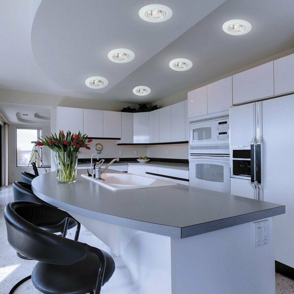 Светильник, встроенный в потолок кухни, представляет собой светильник для скрытого монтажа. Этот вид света идеально подходит для помещений с низкой высотой потолка.