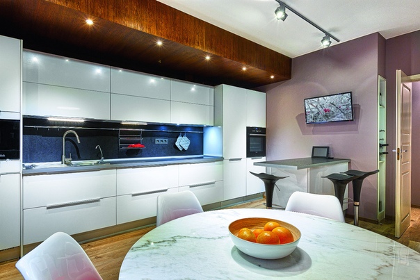 Глянцевый же потолок на кухонном пространстве сейчас на пике моды. Он может выступать в качестве основного акцента в интерьере, но вписать его во все варианты дизайнерских решений вряд ли получится.