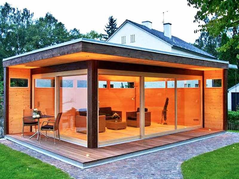 - Полностью закрытая кухня по сути представляет отдельный домик с одной или двумя комнатами. Размеры зависят от планов по её использованию. Стандартный — примерно от 9 до 12 квадратов. Плюсы в том, что использовать закрытое помещение можно круглогодично, бытовая техника и мебель не подвержены капризам природы, а свободный доступ (если это дачный участок) посторонним ограничен. Минусы в дороговизне. Обязателен фундамент глубиной от 50 см и больше, если планируется мансарда или утеплённый чердак. Кирпичные, блочные или каменные стены и соответствующие им кровельные материалы тоже серьёзно облегчат кошелёк. Чтобы избежать дискомфорта в жаркую погоду, необходимо будет достаточное количество окон, цена которых вместе с установкой также обойдётся в кругленькую сумму.