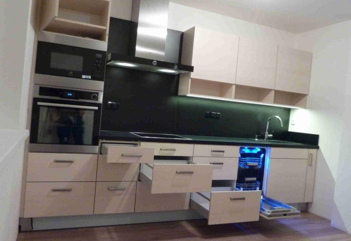 - На кухне в одну линию нет треугольника для самых нужных предметов, а эргономика уступает П-образной, и даже угловой конфигурации.