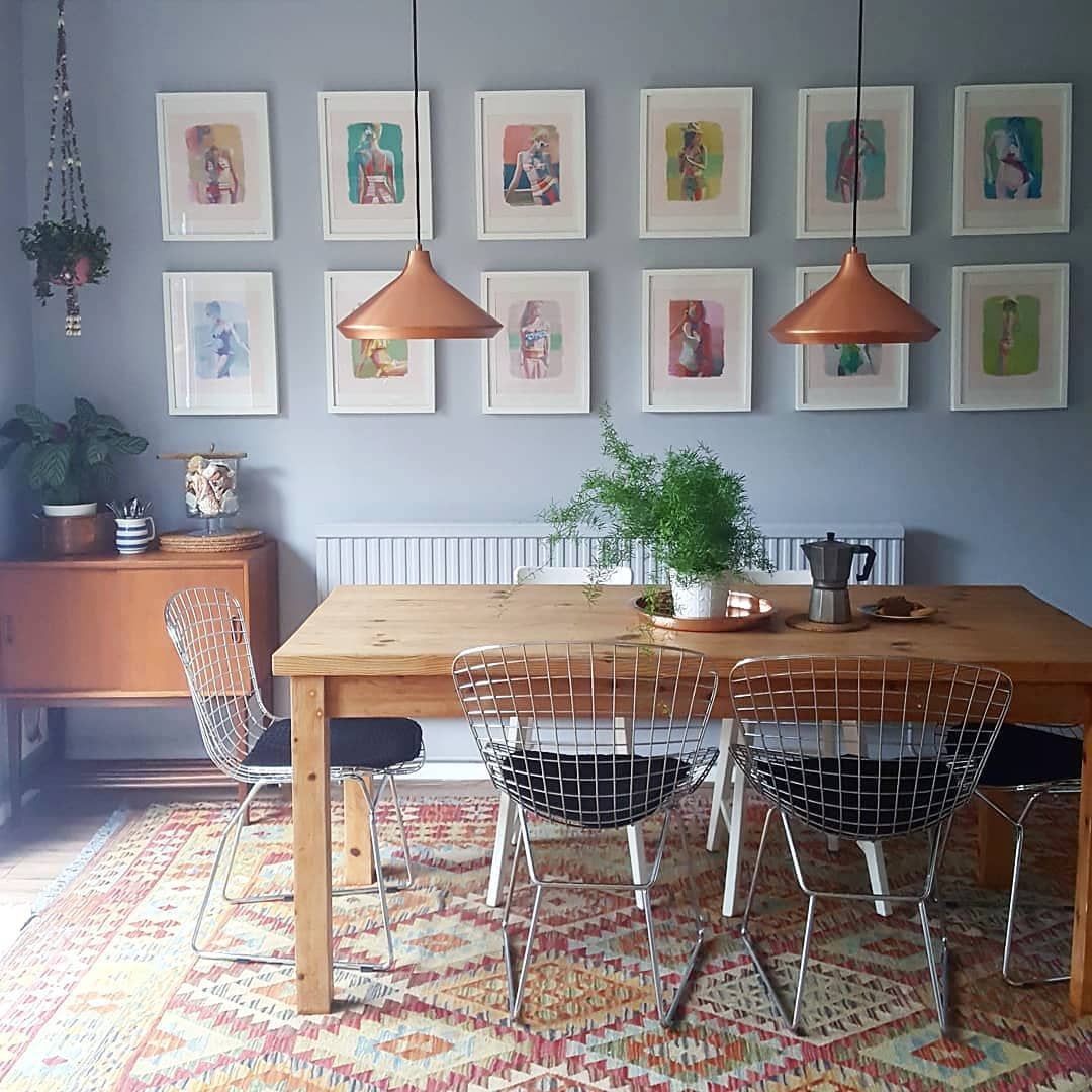 У вас более 4 картинок или картин, или, может быть, вы хотите использовать и другие произведения искусства на стенах? Вы можете создавать красивые и креативные аранжировки! Вы можете смешивать и сочетать произведения искусства друг с другом, чтобы получить более «загруженный» и потрясающий дисплей. Сначала повесьте большие части, а затем заполните стену картинами меньшего размера и другими элементами. Эффект действительно захватывающий!