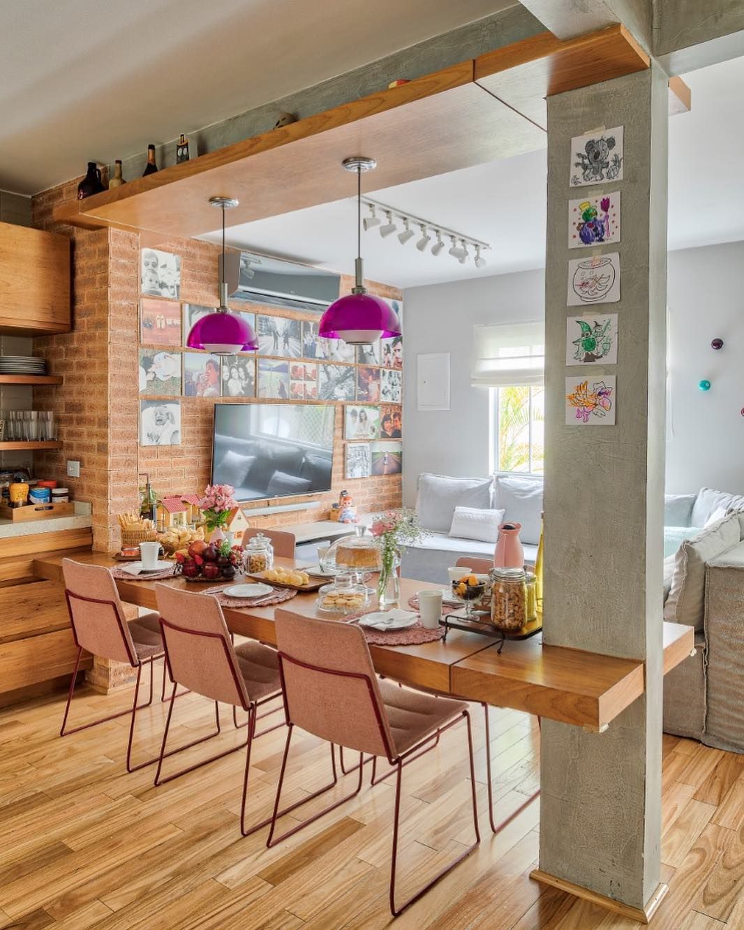 Если вы не занимались профессиональным дизайном интерьера, вам не стоит противопоставлять разделение стеллажной палитры существующей гамме совмещенного пространства. Так или иначе, она должна выступать на чьей-то стороне — либо покупать цвет мебели на кухне, либо повторять палитру, примененную в гостиной. Здесь значение разряда сводится к акценту на самом столе, а на грани, которую он символизирует. Пример на фото показывает, как цветная отделка подставки и кухонного гарнитура четко обозначает, где заканчивается одна зона и начинается другая.