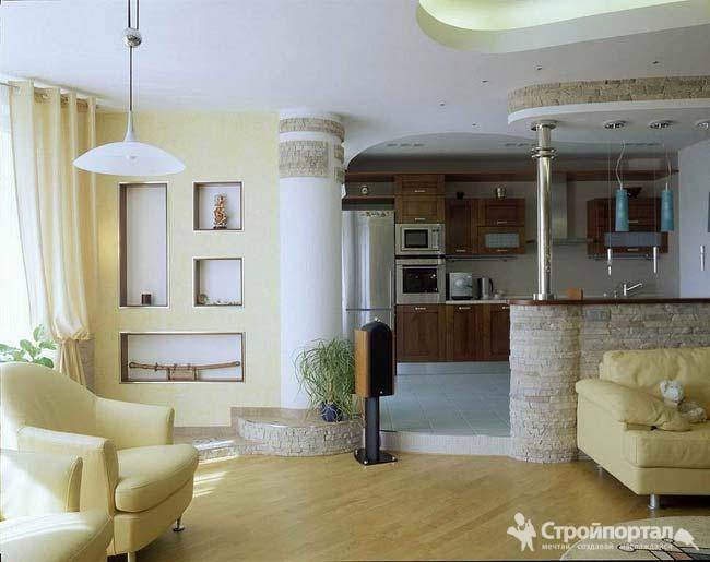 В последнее время большой популярностью пользуется метод объединения отдельных функциональных помещений в квартире. Таким образом достигается эффект визуального расширения пространства, что для стесненных условий стандартной квартирной планировки весьма кстати. Однако при подобном подходе необходимо решить еще одну задачу – разграничить отдельные зоны, придать им некую завершенность.