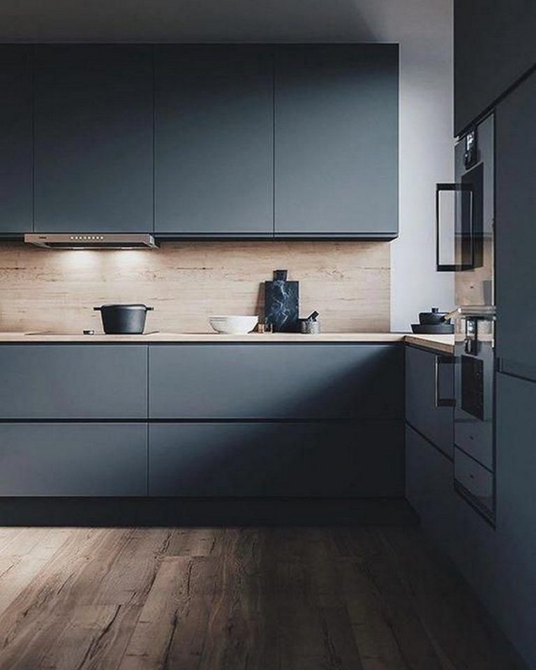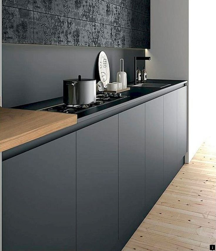Сместив акцент с деревенского и винтажного дизайна кухни, мы хотели бы обратить ваше внимание на этот потрясающий пример модной кухни, в которой использованы современные темно-серые цвета. кухонные шкафы. Эта кухня открытой планировки имеет бетонный пол и столешницу из темного твердого материала. Современные темно-серые кухонные шкафы согреты коричневым фартуком, имитирующим дерево. Чистый и простой дизайн — мечта современного любителя кухни.