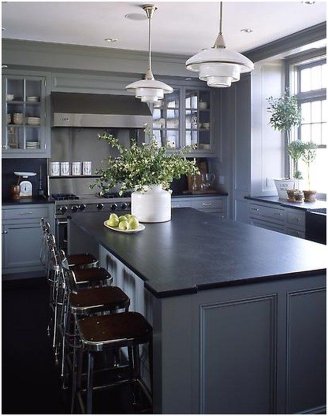 Не бойтесь создать акцент на своей кухне. Не бойтесь ставить черные столешницы на темно-серый остров. Такое сочетание добавит элегантности и стиля вашему дому.