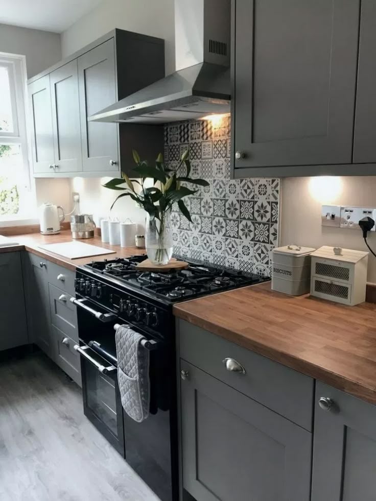 Создать авантюрную и очаровательную кухню можно, если сочетать серые кухонные шкафы с зелеными стенами. Это отличный выбор для тех, кто хотел бы добавить в свою кухню смелый и яркий цвет или естественную атмосферу, используя лесные оттенки.