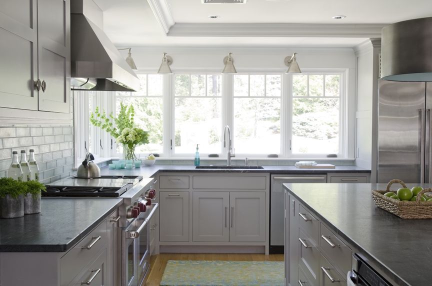 Белый цвет всегда сможет добавить яркости и элегантности. Если вы хотите создать современный, эклектичный или теплый и традиционный кухонный декор, сочетание серых кухонных шкафов и белых столешниц даст вам все необходимое для достижения вашей цели.