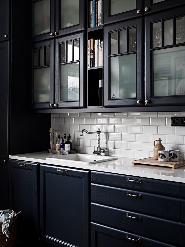 Синие стены в сочетании с серыми кухонными шкафами сохранят прохладные тона и добавят чистоты и обтекаемости на вашей кухне. Мы предлагаем использовать более светлые оттенки синего, чтобы не перегружать темные кухонные стены.