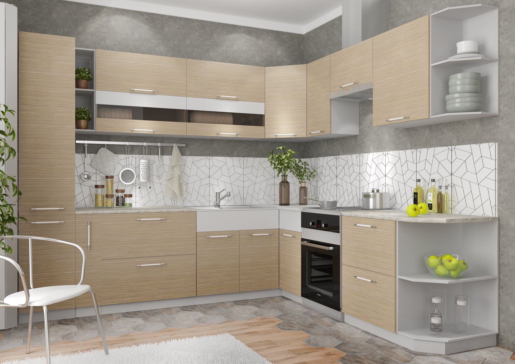 Белая кухня с серым фартуком