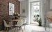 Орси Панос ИнтерьерыОткрытые побеленные кирпичные стены задают индустриальный тон этой кухне с белым круглым обеденным столом с черной кожей и коричневыми бархатными стульями.