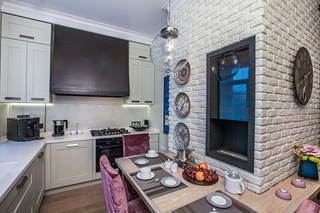 Если кухня маленькая, кирпичиками лучше выложить столовую или рабочую зону, а все остальные поверхности сделать однотонными. Отличным решением станет кладка белого цвета. - Так, как данная отделка имеет не очень хорошие отражающие свойства, кирпичом желательно оформлять стену, расположенную напротив окна. Таким образом естественный свет позволит сгладить подобный недостаток.