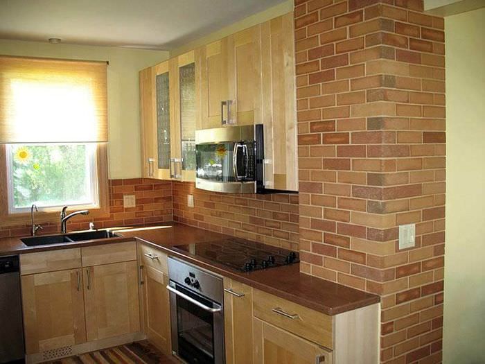 Тумбочки и шкафы рабочей поверхности кухни с помощью облицовочного кирпича также можно удачно оформить. Благодаря кладке можно получить оригинальную копию настоящего камина. Кирпичом можно сделать и потолок, но такое смелое решение в квартирах будет не уместным, подходит оно только для загородных домов.