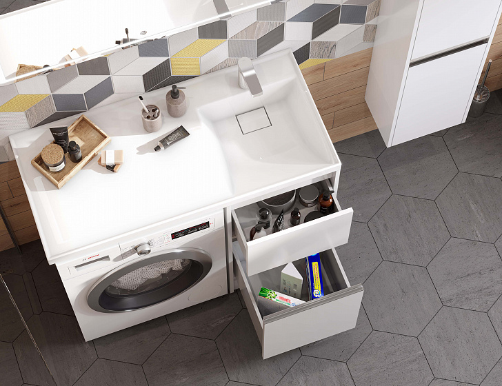 - Во-первых, вам уже не нужно будет думать, куда поместить раковину, а куда стиральную машину – столешница вместит и то, и другое, сэкономив пространство и придав стилю законченность.