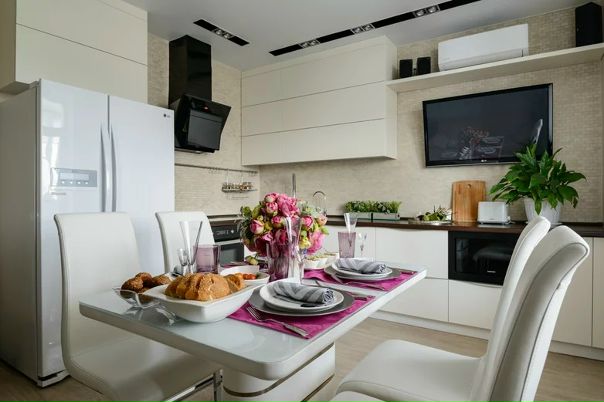 - Откажитесь от навесных шкафов, освободив доступ к телевизору. Некоторые хозяйки не представляют помещение без них, но когда их нет, все помещение выглядит просторнее. Заменить их можно выдвижными, выкатными системами.