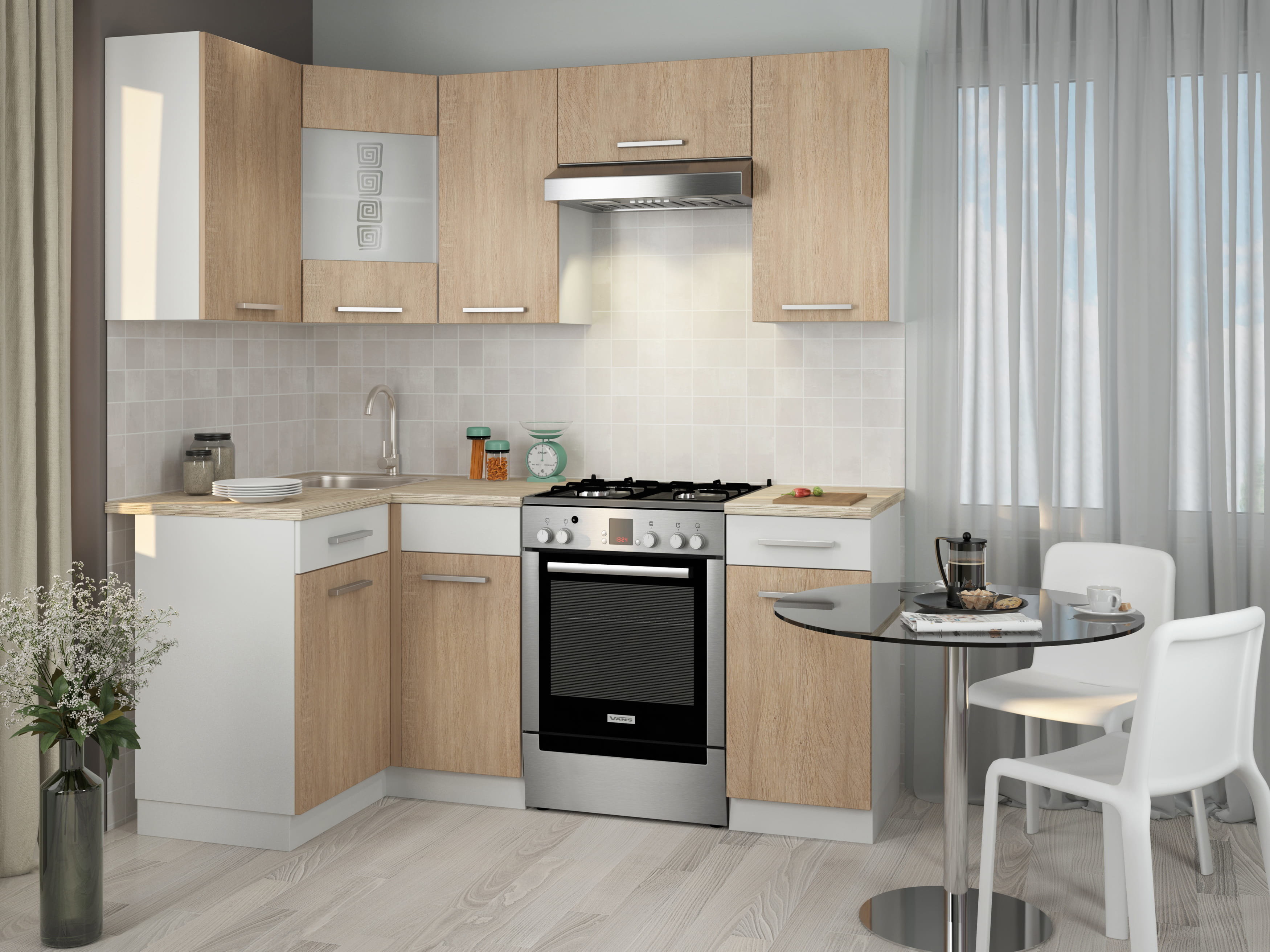 Небольшой кухонный гарнитур, предназначенный для установки вдоль двух смежных угловых стен