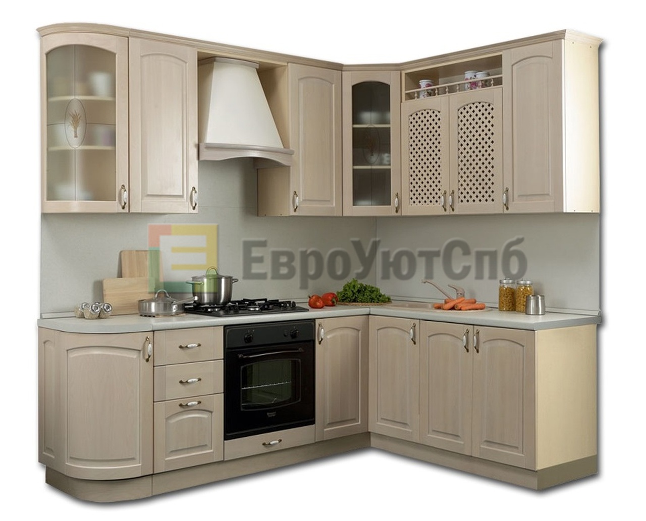 Такие углы очень вместительные, а также удобные, поскольку места перед мойкой или плитой гораздо больше. Одновременно недостатком станет сильно глубокий скошенный угол, что усложнит доступ к фартуку. Поэтому важно следить, чтобы глубина модуля не была большой.