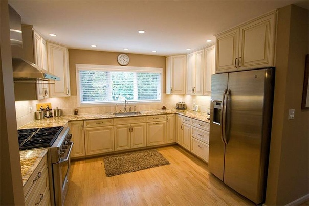 Расположенный вдоль трех стен кухонный гарнитур — удачное решение для просторной кухни с правильной геометрией и хорошим освещением.