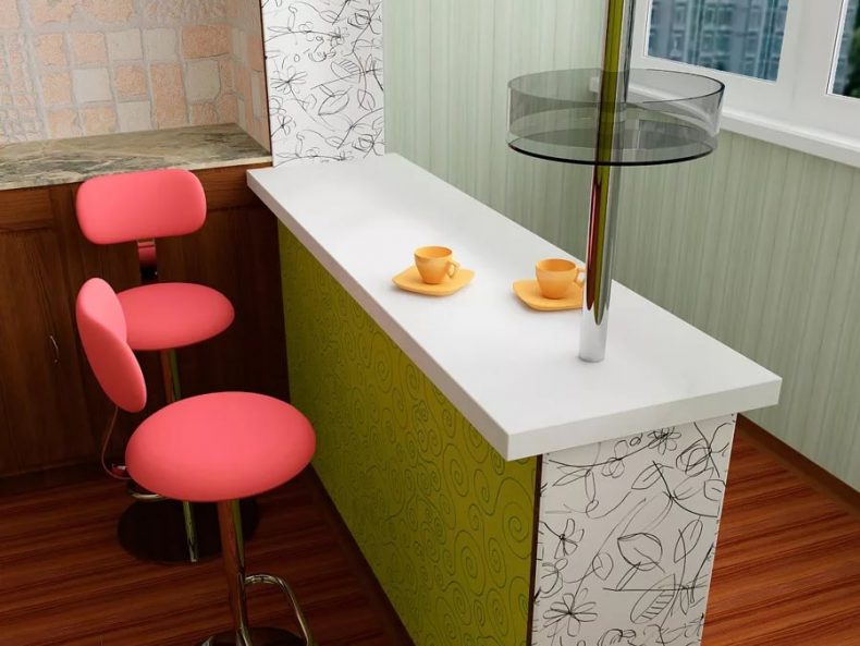 При совсем небольших размерах кухни можно установить маленькую барную стойку мобильной конструкции, имеющую поворотный, выдвижной или откидной механизм, что позволяет не загромождать кухню, устанавливая предмет лишь по необходимости и легко убирая обратно.